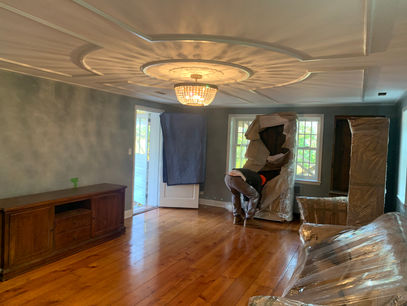 -Demolition-Taping-Fireplace restoration-Floor repair-Ceiling panel fabrication and installation-Medallion design-Fabrication and installation-Existing furniture alteration